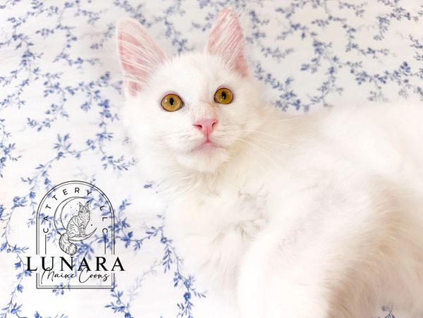 King Zeus is our breathtaking solid white male with striking copper-gold eyes and a gentle, affectionate temperament. His calm confidence and loving personality make him a truly special addition to our cattery. Zeus carries beautiful structure, expressive features, and a naturally sweet disposition that shines through in everything he does.